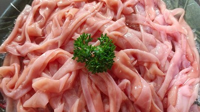 外观上鸭肠呈乳白色,粘液多,异味较轻,具有韧性。